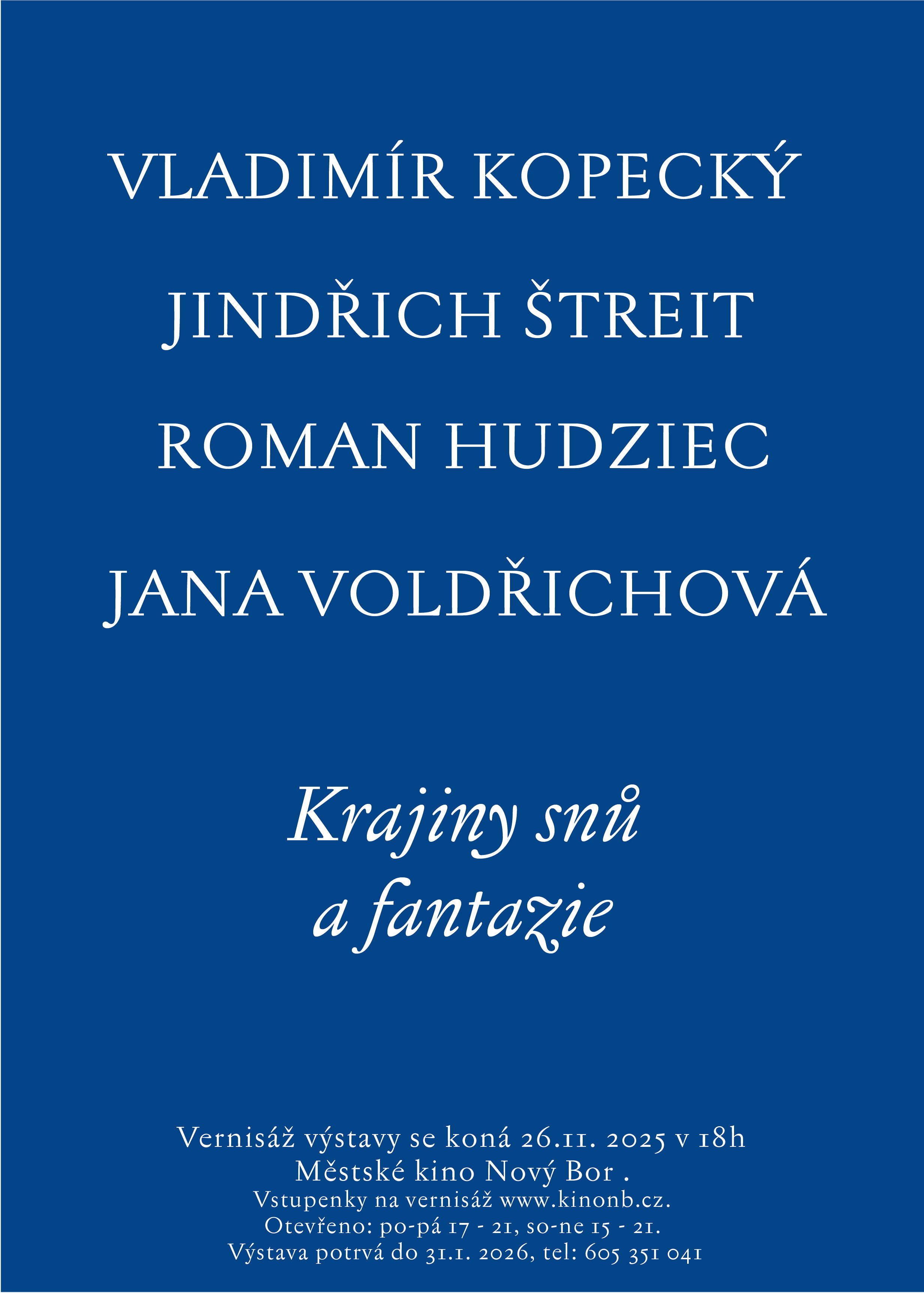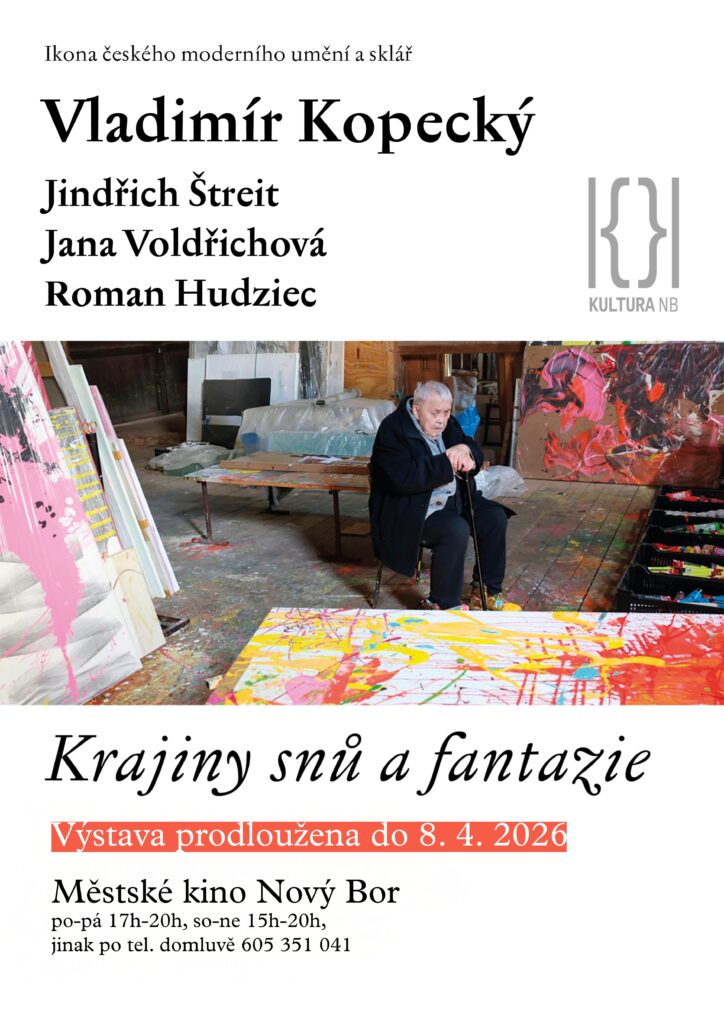 Rok 2026, kdy Městské kino v Novém Boru oslaví své sté výročí, bude věnován nejen filmovým projekcím, ale i výstavám. Výstavní cyklus v kině představí šest výrazných osobností českého výtvarného umění, jejichž tvorba se pohybuje na pomezí obrazu, fotografie, grafiky a filmové estetiky.